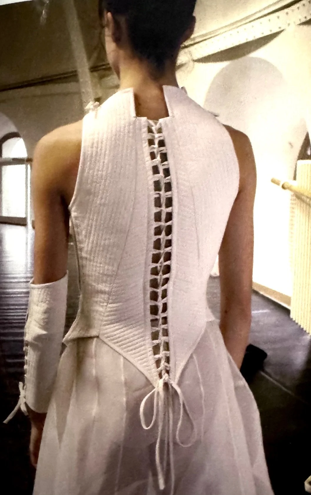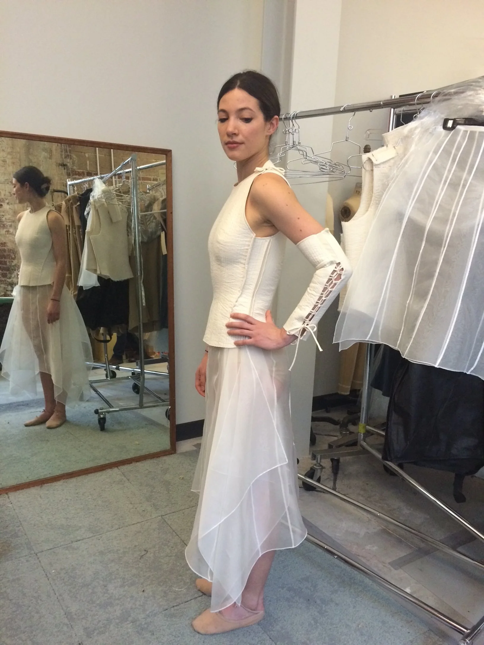 My initial idea for the costumes came from fencing. I wanted to give the dancer’s bodies more protection so I created quilted padded corsets out of cotton padding and muslin. One of the initial cast of dancers had injured their arm and asked for an arm protector. Soon all 3 dancers wanted one. There were 2 skirts for the female dancer- a longer and a shorter version for the sections where a longer skirt could interfere with the movement. In contrast to the top the silk organza skirt was very fragile-