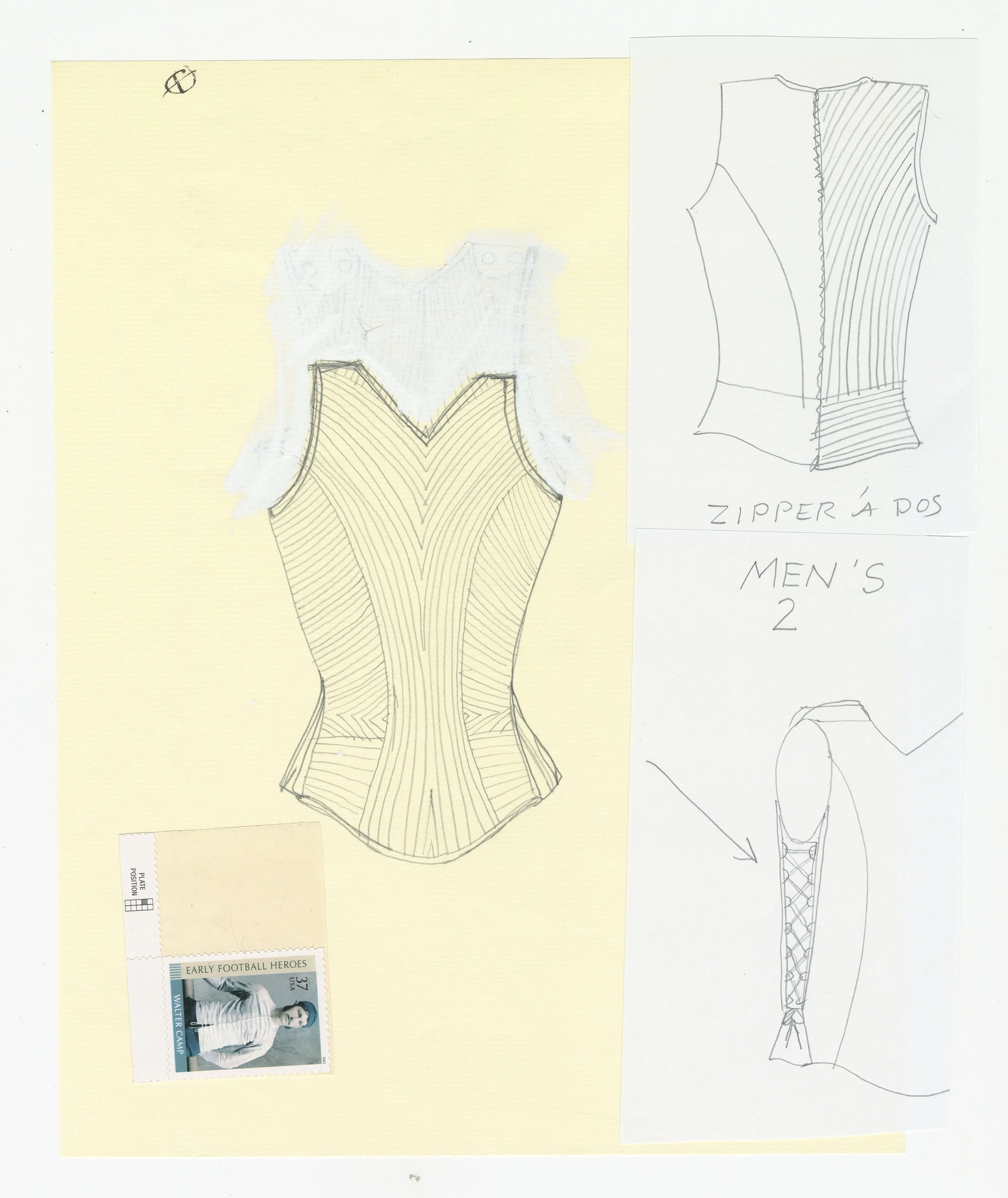 Initial sketches for the costumes and postage stamp of early football player which inspired the lacing