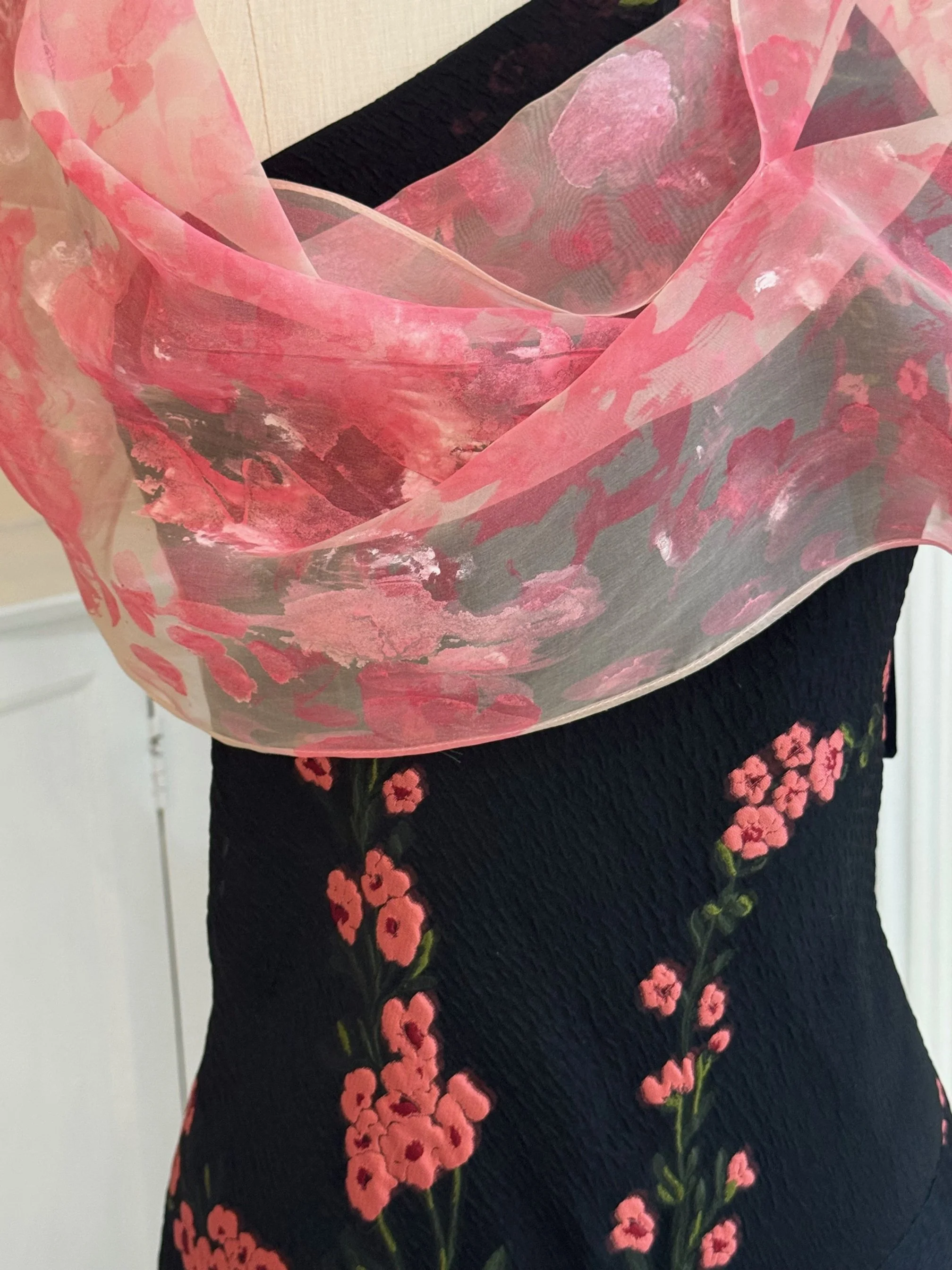 I gave the scarf to my collaborator, artist Eve Vaterlaus, to come up with some ideas. After some back and forth she painted a motif of roses and apples that the client loved.