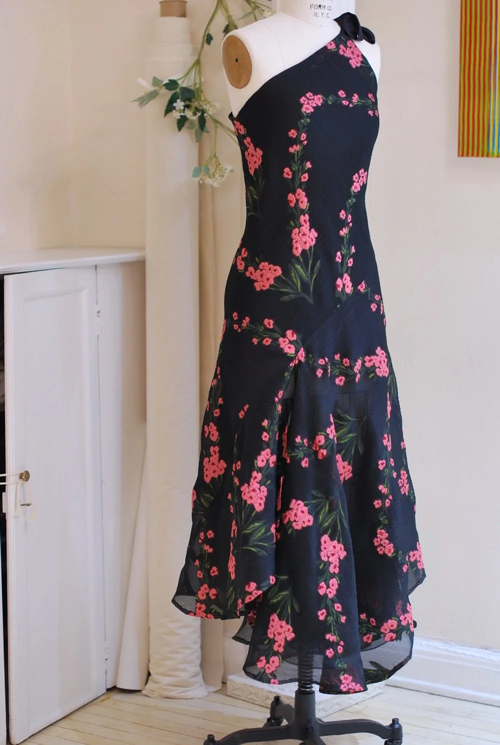 Of course you want to look beautiful for your son’s wedding. I made 2 MOG dresses this summer for weddings in late August and October. For one of the weddings the bride requested that the guests all wear black. This was a bit daunting for my client, but because a bit of color was allowed , she loved this silk cloqué with fushia flowers that I had in my atelier. We had worked together before and the process was joyful and seamless.