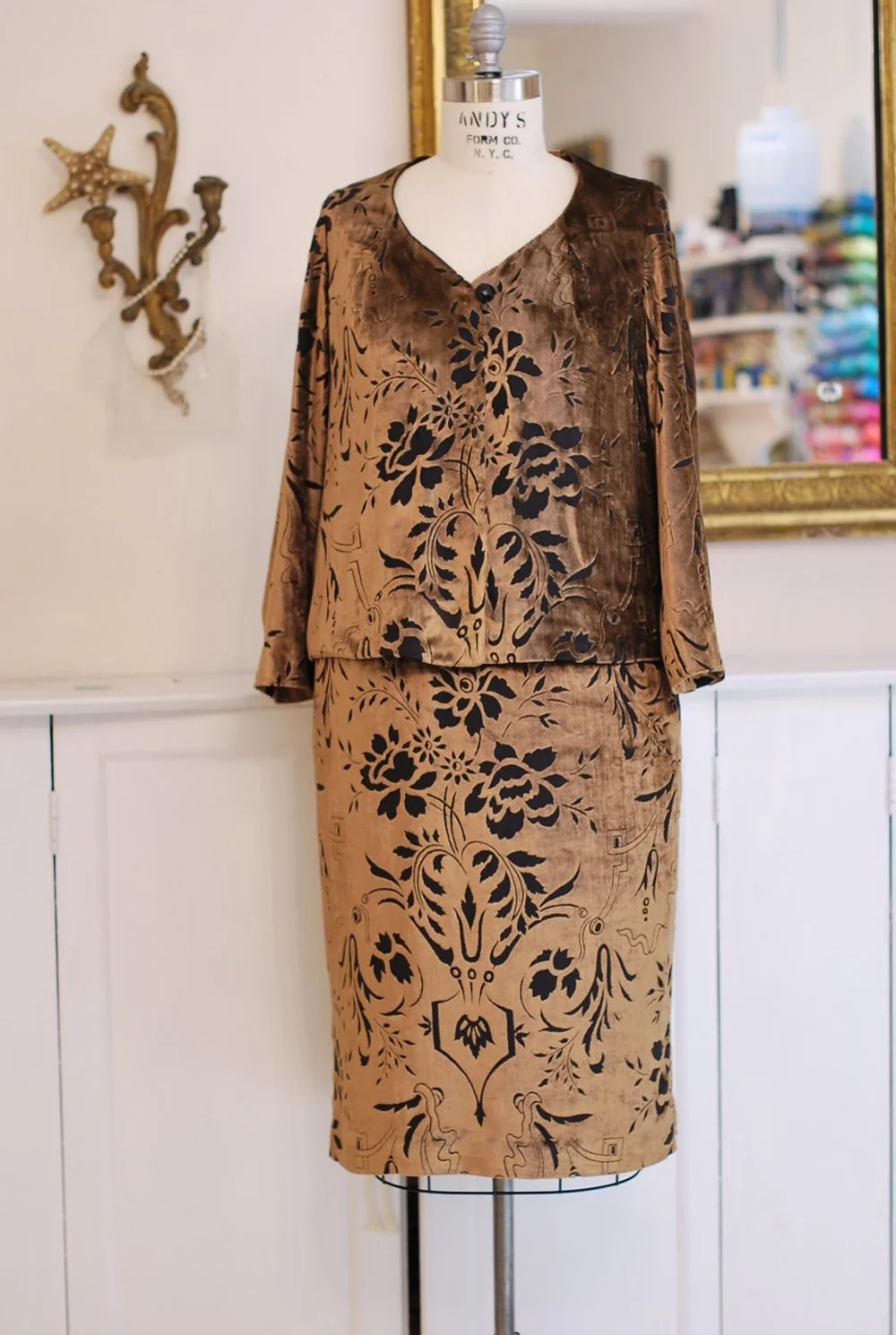 2 pc skirt and softly tailored jacket, lined in silk chifon and crepe de chine