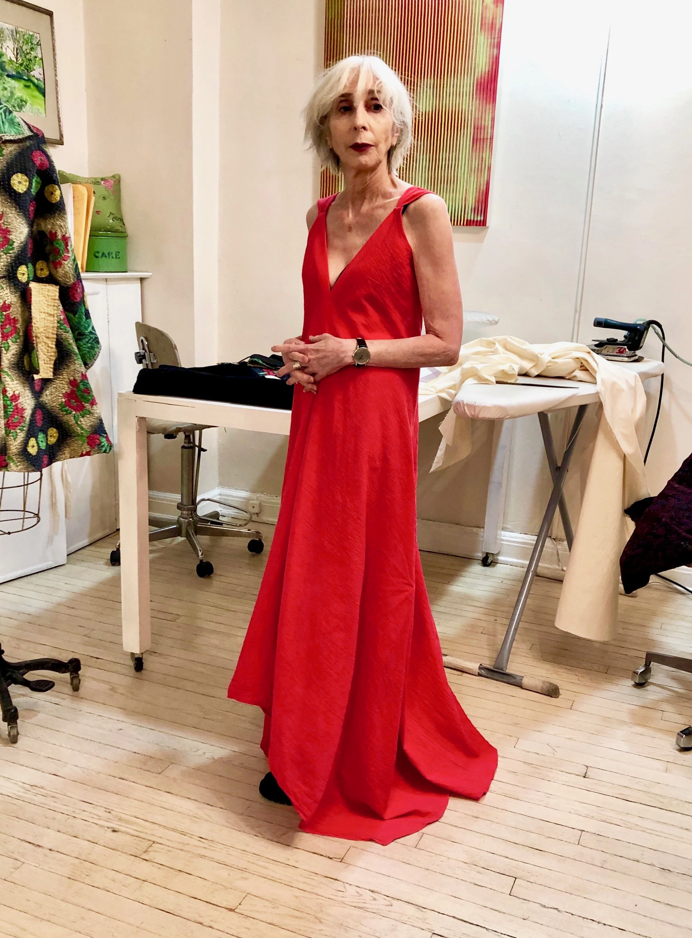 Artist Judith Linhares wearing Elizabeth Cannon 4-ply silk jacket and silk chiffon blouse at her show at Massimo deCarlo Gallery in London