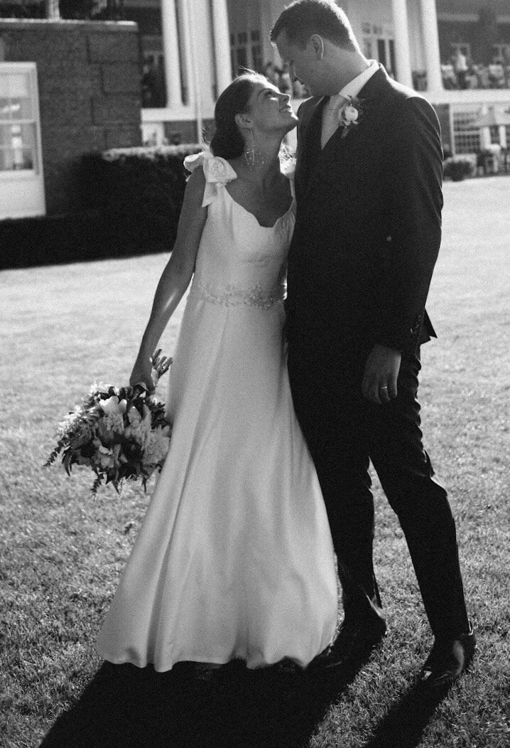 Lucy Debernardi wedding dress in 4-ply crepe with beaded lace and chiffon detail and trapunto stitching on bodice